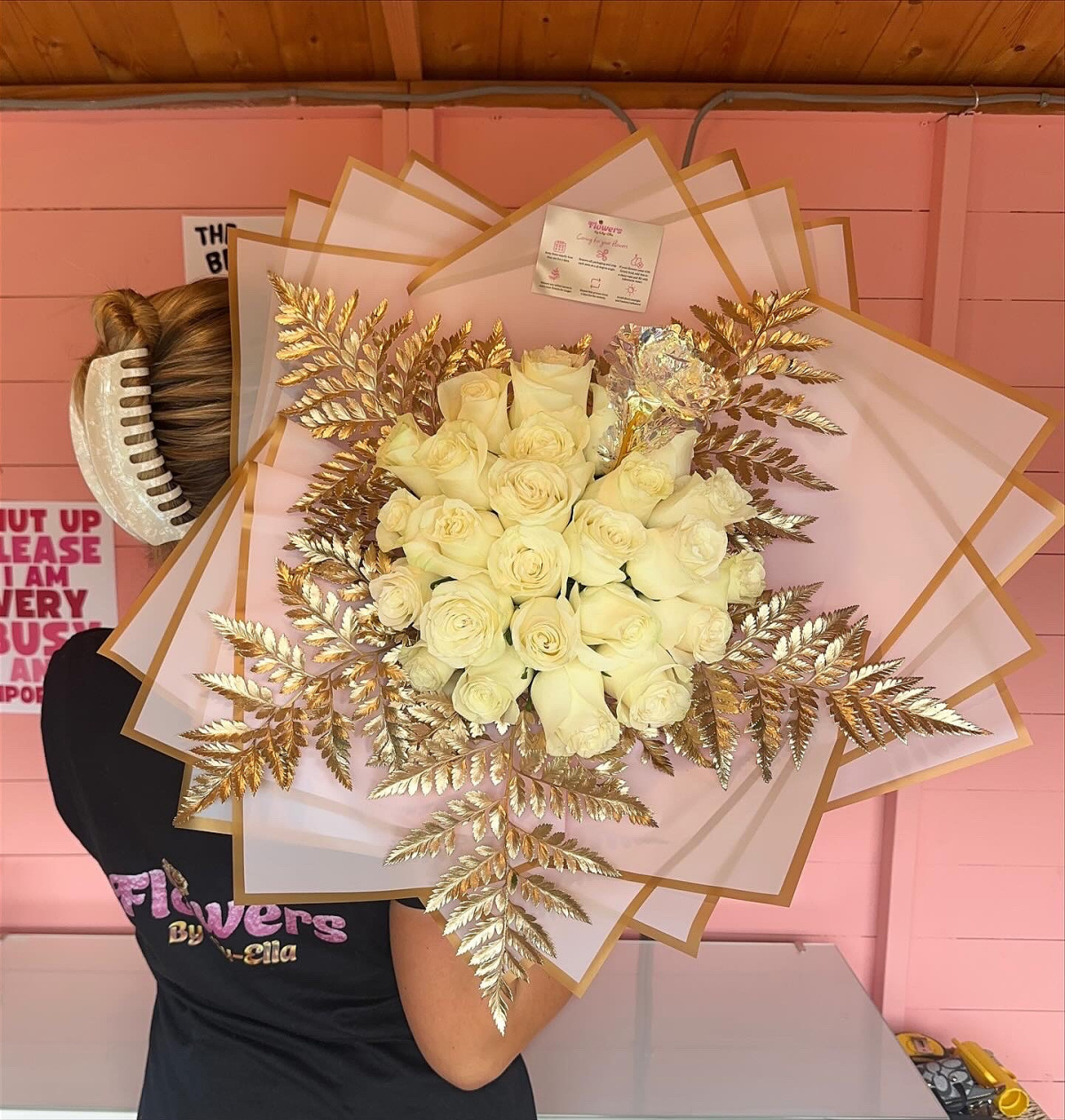 You will receive a hand tied bouquet made to your chosen size using premium large headed white Roses, edged with beautiful gold-sprayed Leather Leaf, already in a box with water.